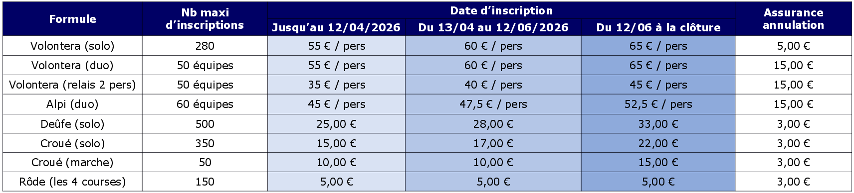 Pour l’AlpiTrail et la Volontera Duo/Relais, l’assurance-annulation s’applique à l’équipe et, dans le cas de demande d’annulation, un seul certificat médical sera demandé.